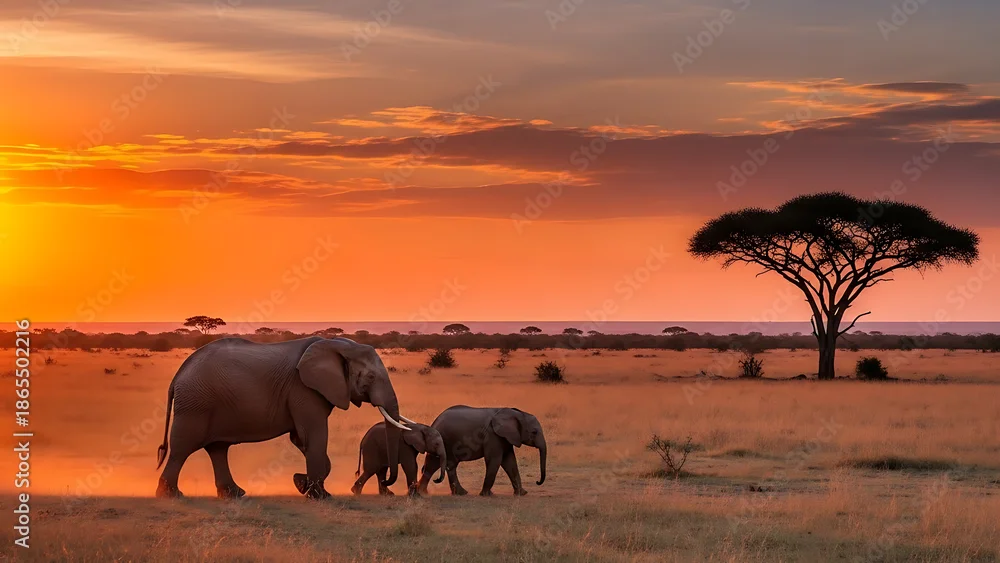 Fototapeta samoprzylepna Wide angle view of an elephant family migrating across the savanna during golden hour - słonie - Picturewall.pl