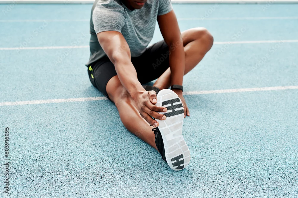 Athlete, sitting and track for stretching legs to start training, exercise or running for fitness outdoor. Man, runner and warm up for muscle, body and wellness at stadium for race, contest or sports