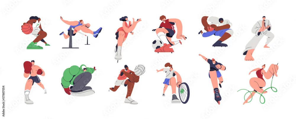 Athletes and sports set. Professional football, basketball, tennis, soccer, rugby players, boxing, gymnastics, karate, track and field sportsmen. Flat vector illustrations isolated on white background