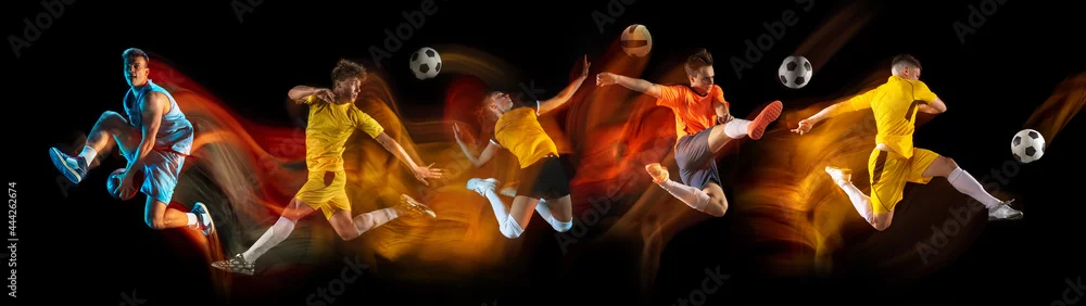 Fototapeta samoprzylepna Development of motions of different kinds of sport games. Young men in action isolated over dark background in neon mix colored light. Flyer.