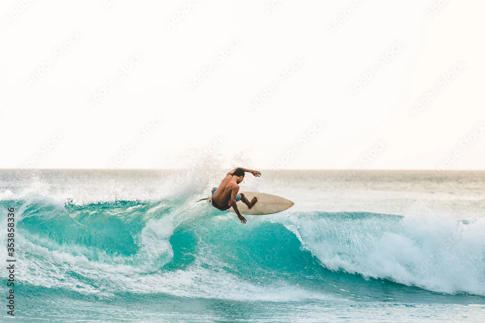 Fototapeta samoprzylepna professional surfer riding waves in Bali, Indonesia. men catching waves in ocean, isolated. Surfing action water board sport. people water sport lessons and beach swimming activity on summer vacation