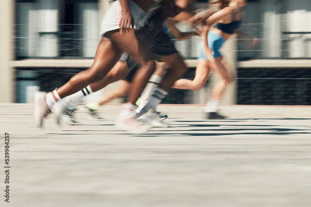 Running, motion and group of people on path together for marathon race, fitness and speed. Fast run team, urban runner club and racing in city street training workout with feet and legs on ground.