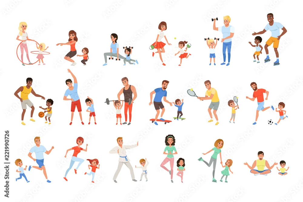 Set with parents and their children doing different sport exercises. Family time. Physical activity and healthy lifestyle concept. Colorful flat vector design