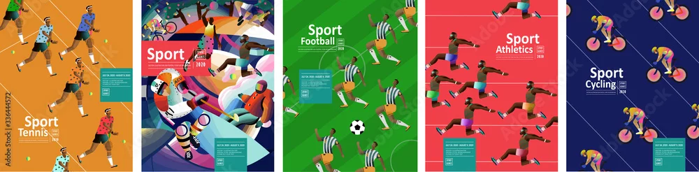 Sport games! Vector illustrations of athletes, tennis, football, running, jumping, athletics and cycling. Drawings for poster, banner and background.