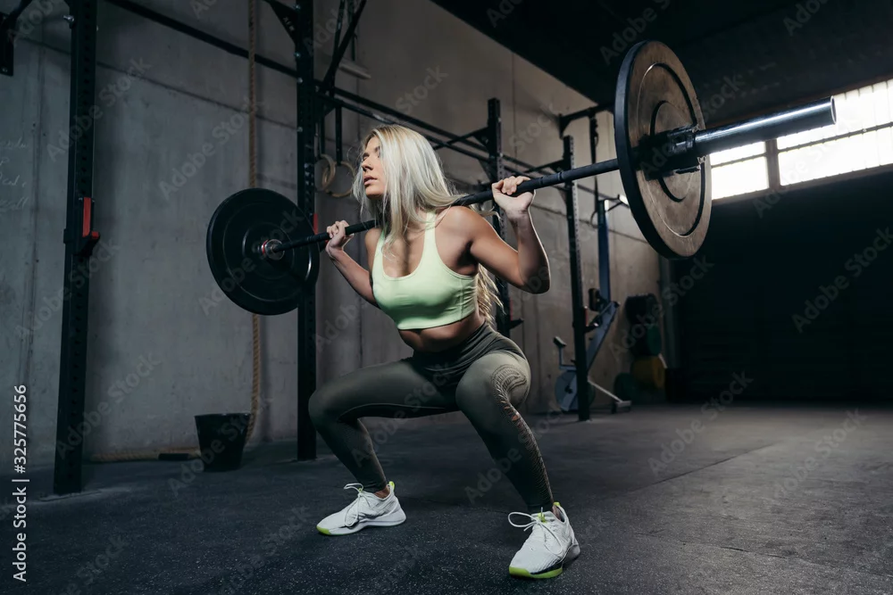 Fototapeta samoprzylepna Young blonde woman with barbell flexing muscles and making shoulder press squat.