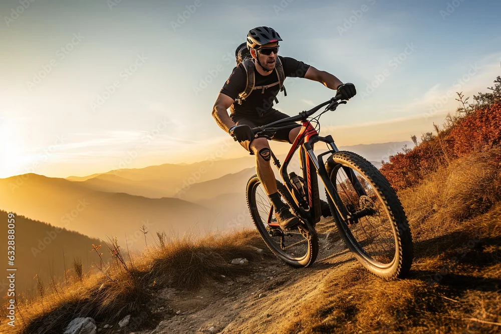 Fototapeta samoprzylepna Young man riding bicycle on mountain trail sport