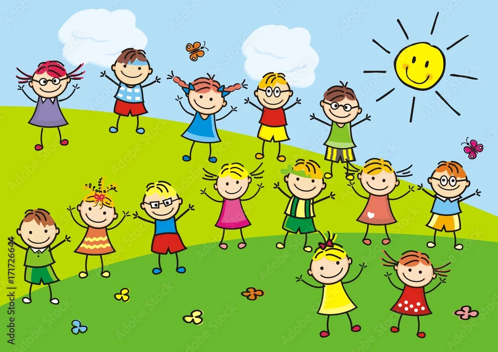 Fototapeta samoprzylepna Szczęśliwi dzieciaki na łące, wektorowa ilustracja - Picturewall.pl