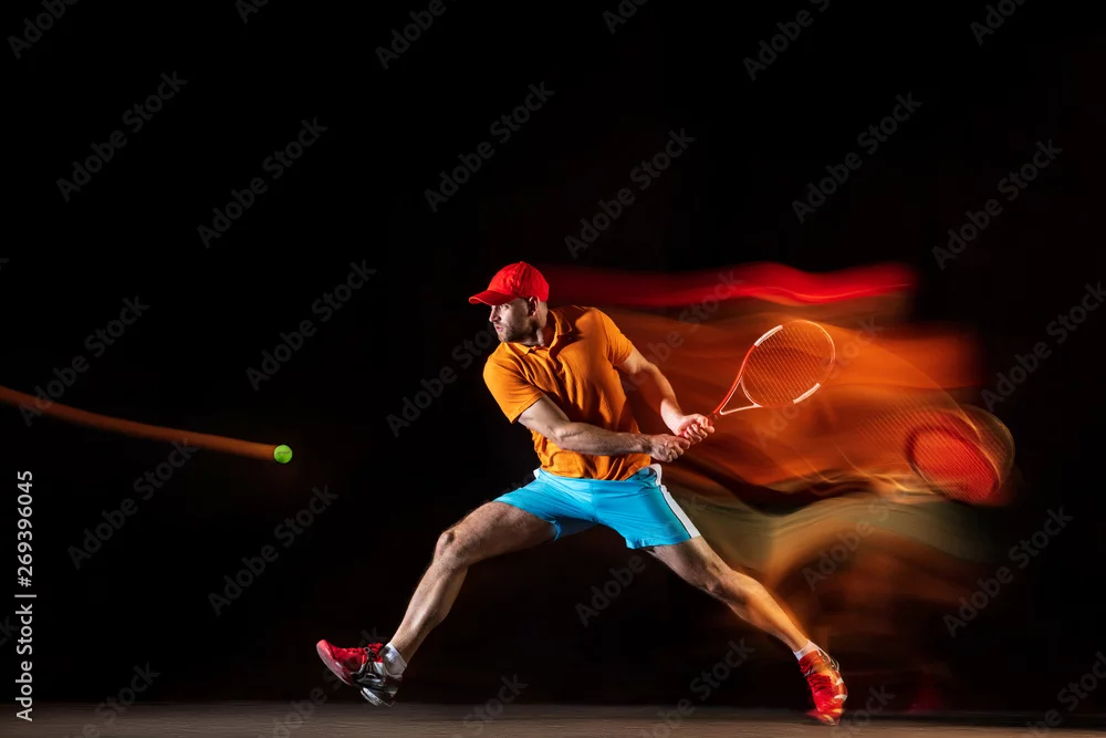 Fototapeta samoprzylepna Jeden caucasian mężczyzna bawić się tenisa odizolowywającego na czarnym tle w mieszanym świetle. Studio strzał dysponowany młody męski gracz w ruchu lub akci podczas sporta gry. Pojęcie ruchu, sportu, zdrowego stylu życia.
