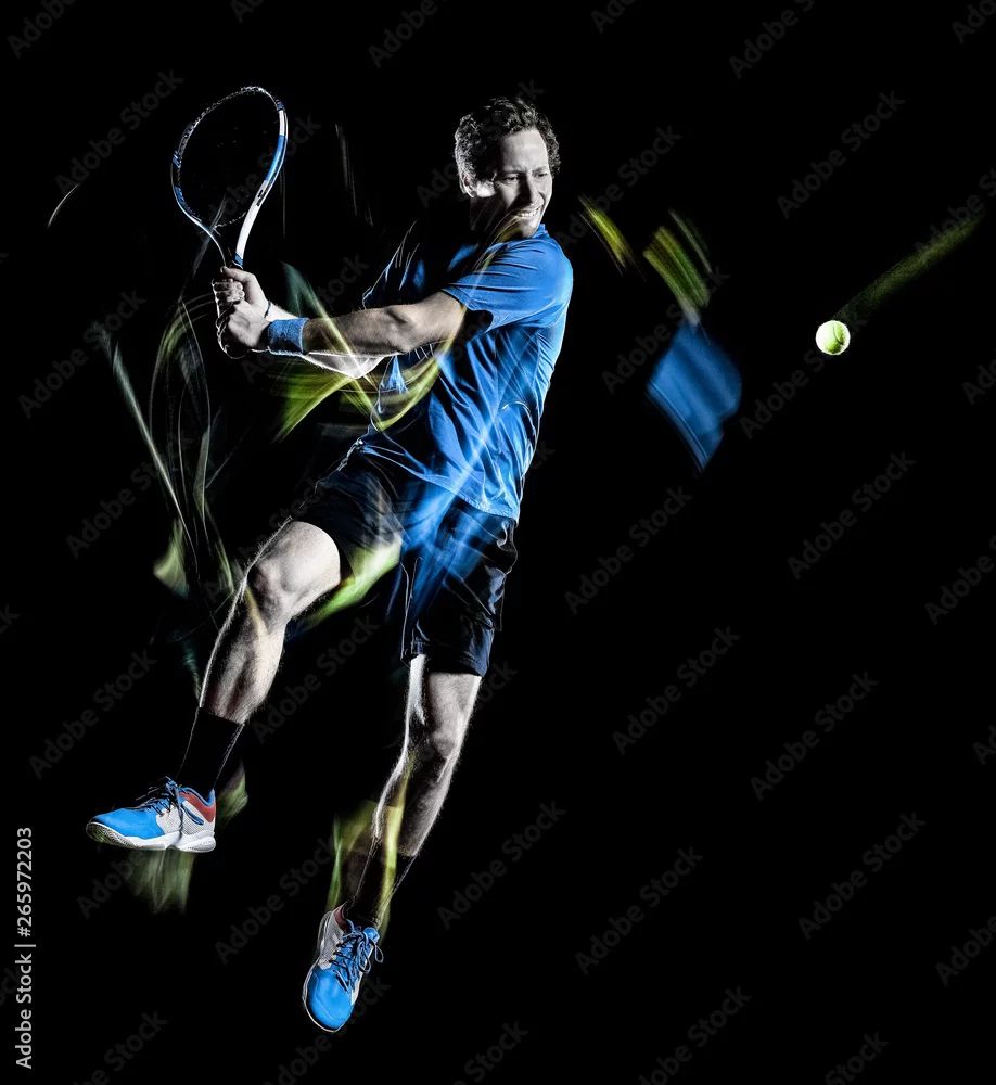 Fototapeta samoprzylepna jeden kaukaski tenisista mężczyzna na białym tle czarne tło w jasnym ruchu prędkość malowania