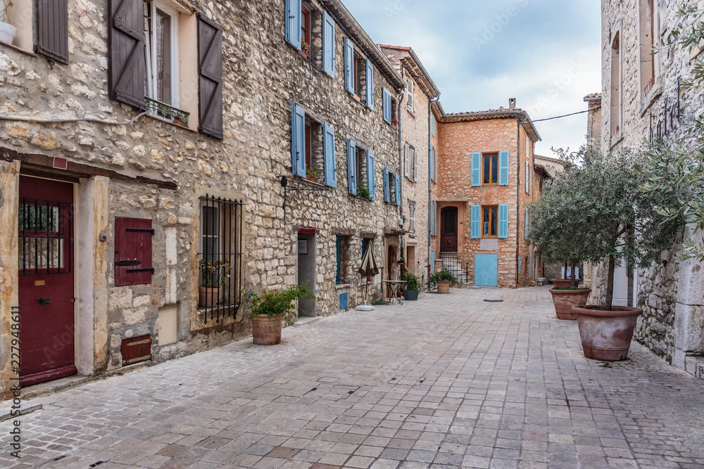 Fototapeta samoprzylepna Wąska brukowana ulica z kwiatami w starej wiosce Tourrettes-sur-Loup, Francja.