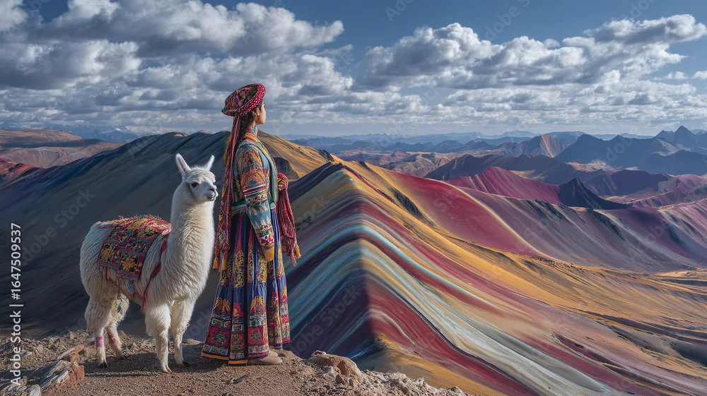Fototapeta samoprzylepna Młoda kobieta w tradycyjnym stroju peruwiańskim spaceruje z lamą na tle Gór Tęczowych Vinicunca w Peru.