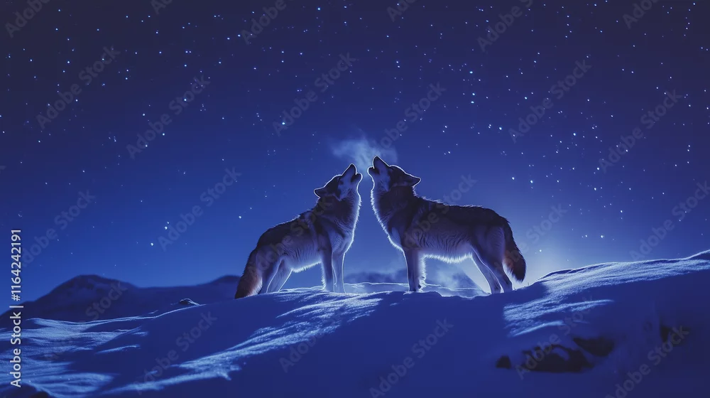 Fototapeta samoprzylepna Wilki stojące na śnieżnym zboczu, wyjąc do nieba na tle rozgwieżdżonego nieba pełnego ciszy i piękna.