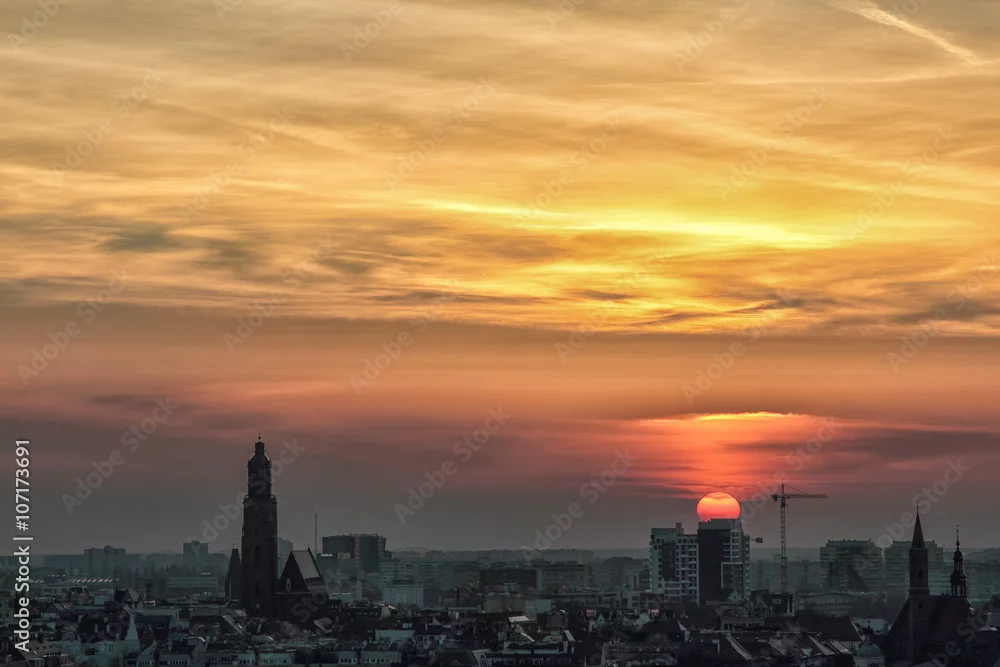 Fototapeta samoprzylepna WROCŁAW, POLSKA - 02 kwietnia 2016: Widok z lotu ptaka Wrocławia. Miasto linia horyzontu, kościół i budynki w starym miasteczku podczas pięknego zmierzchu, Kwiecień 02, 2016 w Wrocławskim, Polska.