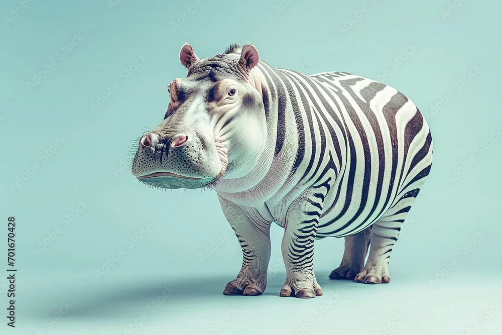 Fototapeta samoprzylepna Hippo with zebra stripes on pastel blue background. Ai generative art