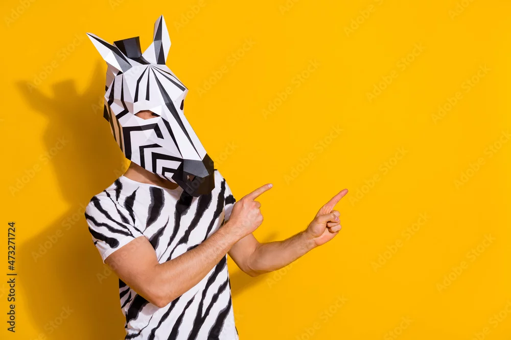 Fototapeta samoprzylepna Photo of unusual guy in zebra mask point finger empty space demonstrate theme event promo isolated over yellow color background