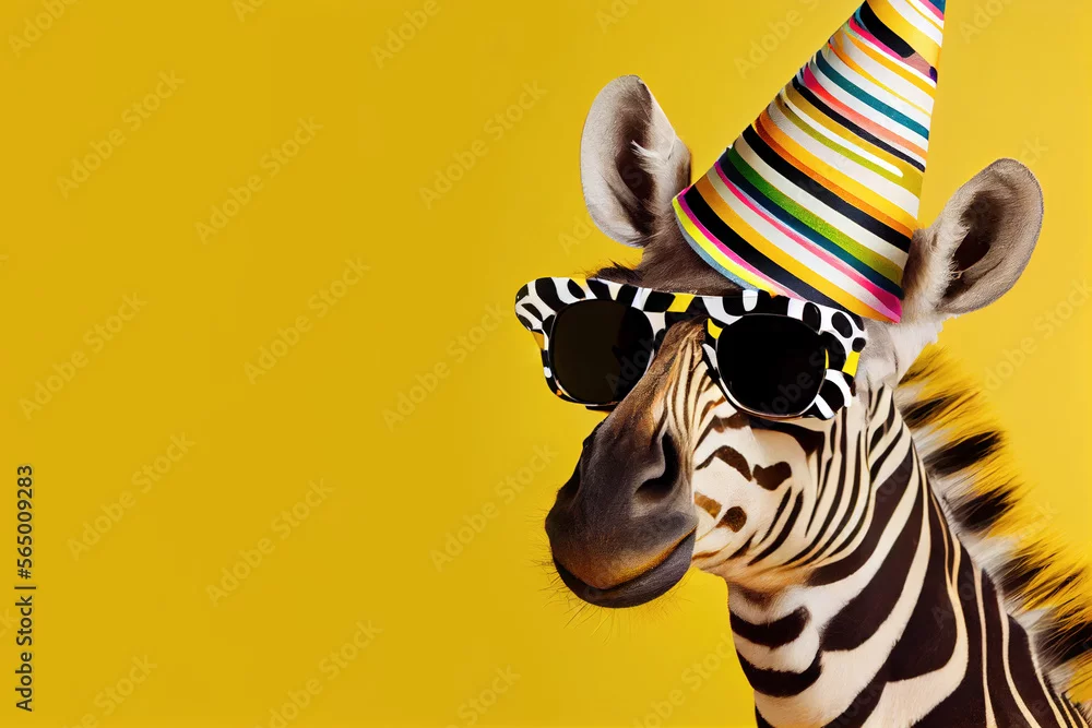 Fototapeta samoprzylepna zebra in party hat and sunglasses over yellow background. Generative Ai - zebry - Picturewall.pl