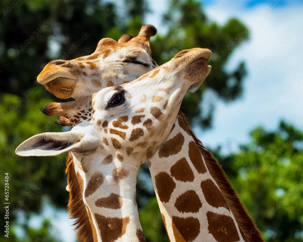 Fototapeta samoprzylepna Adult giraffes grooming each other - żyrafy - Picturewall.pl