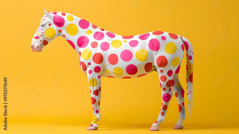Fototapeta samoprzylepna An animal figure resembling a horse painted in pink and yellow polka dots on a yellow background, resembling a toy giraffidae with a terrestrial snout and tail