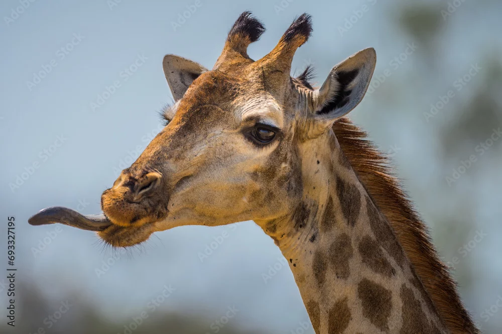 Fototapeta samoprzylepna Angolan giraffe sticking its tongue out - żyrafy - Picturewall.pl