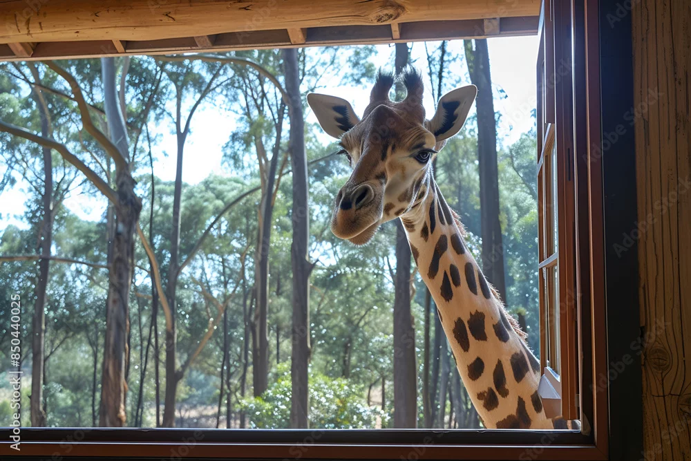 Fototapeta samoprzylepna Cute funny giraffe looks out window of house on second floor. Hotel in nature safari park. Eco zoo reserve. AI Generative