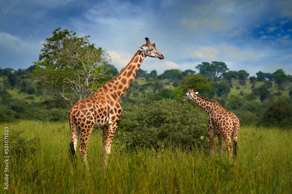 Two giraffe in the green vegetation with blue sky, wildlife nature, Okavango, Botswana in Africa. Mother and young in nature. Wildlife Botswana