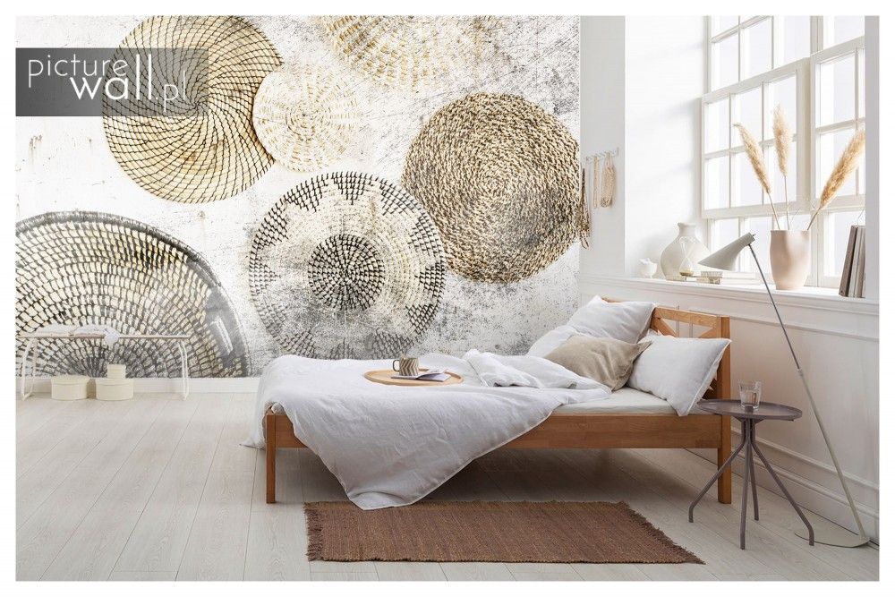 Fototapeta Wiklinowe okręgi w kolorze jest pełna naturalnego akcentu i spokojnej elegancji. Motyw wiklinowych plecionek ujętych w geometryczne okręgi tworzy ciepły, organiczny wzór, który nadaje wnętrzu przytulności i charakteru. Świetna opcja do stylu boho, skandynawskiego czy rustykalnego — idealna, gdy chcemy wprowadzić do sypialni harmonię, teksturę i subtelność.