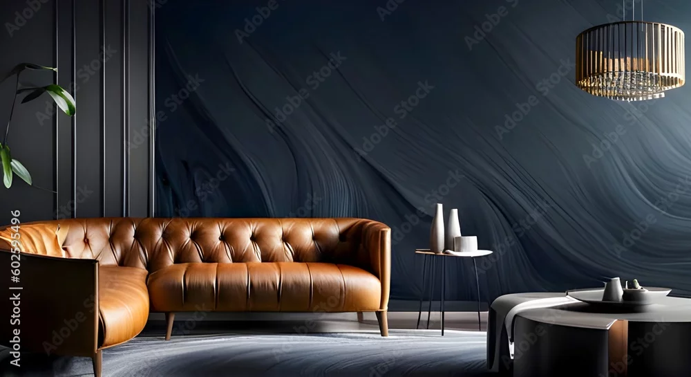 Fototapeta Interior of modern living room with black walls, concrete floor, brown leather sofa and coffee table. Generative AI.