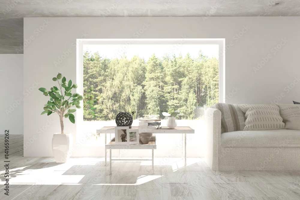 Fototapeta Biały pokój z sofą i zielony krajobraz w oknie. Skandynawski wystrój wnętrz. Ilustracja 3D