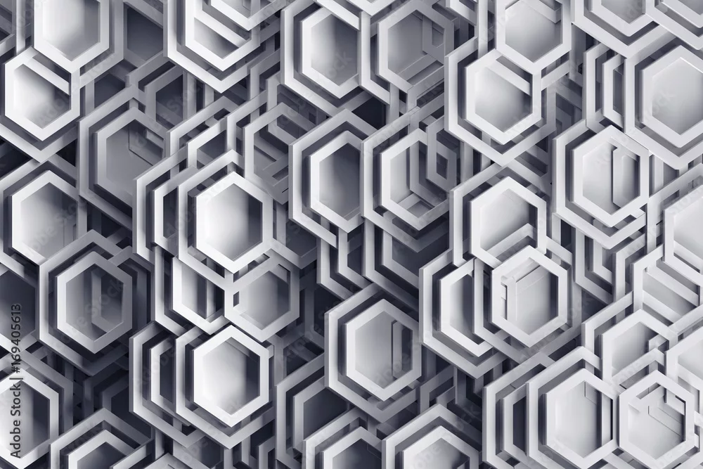 Fototapeta tło z abstrakcyjnie losowo rozmieszczonych sześciokątnych kształtów i ramek, 3d