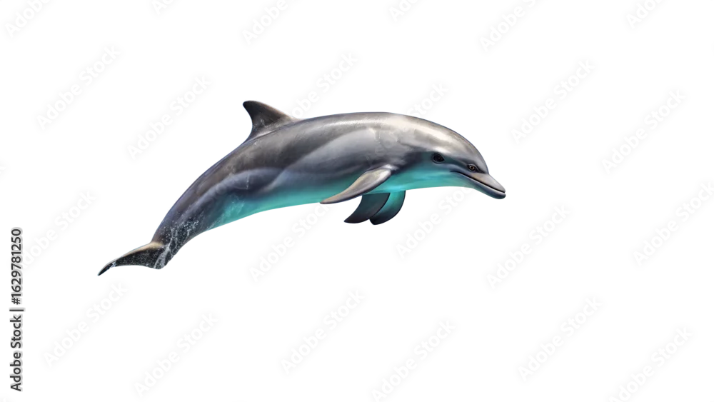 Fototapeta A sleek grey dolphin leaping out of the water, showcasing its powerful body and playful nature, isolated on transparent background