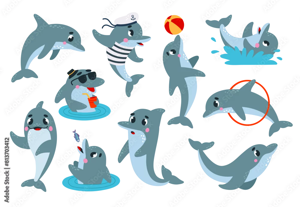 Fototapeta Cartoon dolphins. Funny dolphin performing and doing tricks. Underwater animals in different poses and emotions, classy vector sea characters