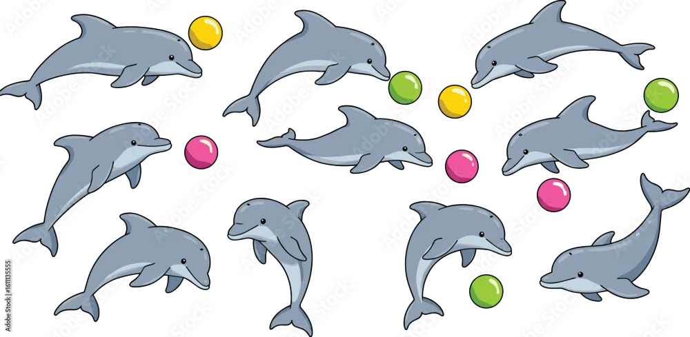Fototapeta Cute cartoon dolphins playing colorful balls, funny dolphin illustrations, playful marine animals, ocean life vector, kids friendly, happy dolphins collection, underwater fun, animal character set - delfiny - Picturewall.pl