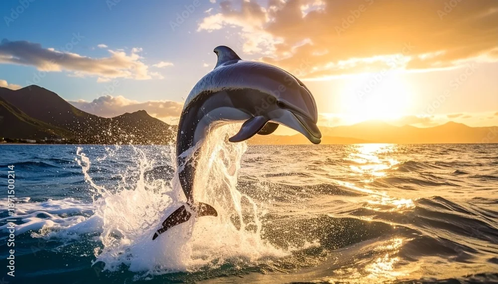 Fototapeta dolphin jumping at sunset - delfiny - Picturewall.pl