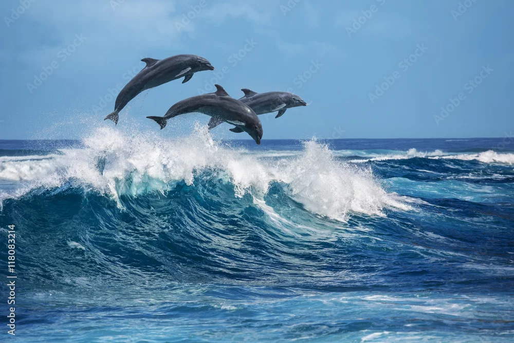 Fototapeta Figlarne delfiny skaczące nad falami. Hawaje Ocean Spokojny scenerii przyrody. Zwierzęta morskie w naturalnym środowisku.