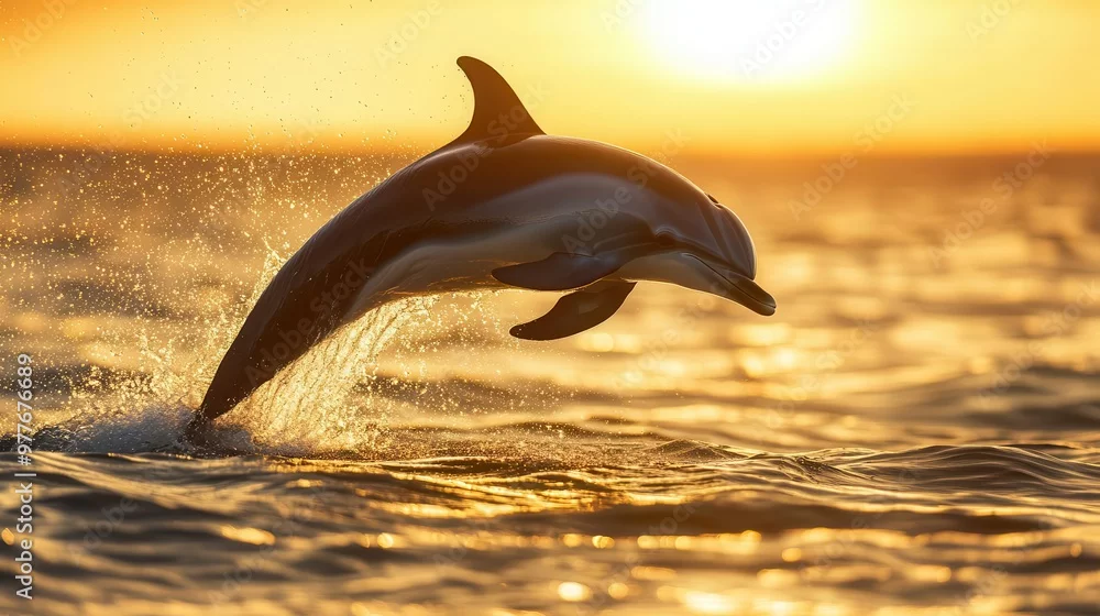 Fototapeta Graceful dolphin leaping out of the ocean, splashing water droplets, golden sunset in the background