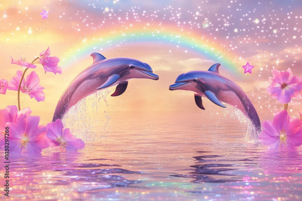 Fototapeta Two dolphins leap gracefully against a vibrant sunset with colorful flowers and a rainbow backdrop