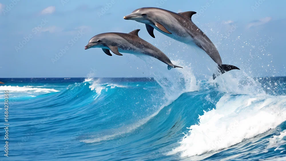 Fototapeta Two dolphins leaping out of a wave in the ocean under a bright blue sky on a sunny day in the sea