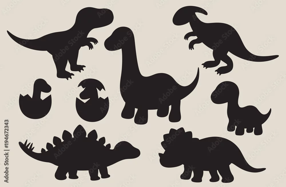 Fototapeta Ilustracja wektorowa sylwetki dinozaurów, w tym Stegozaur, Brontozaur, Velociraptor, Triceratops, Tyrannosaurus rex i Spinozaur. - dinozaury - Picturewall.pl