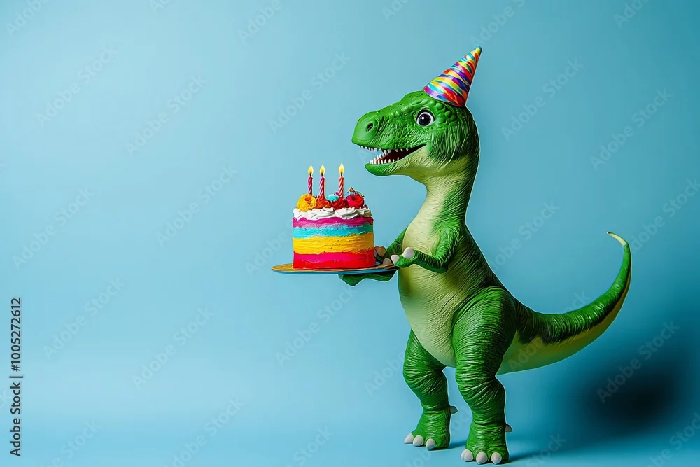 Fototapeta A green dinosaur wearing a party hat holds a colorful birthday cake with lit candles on a blue background.