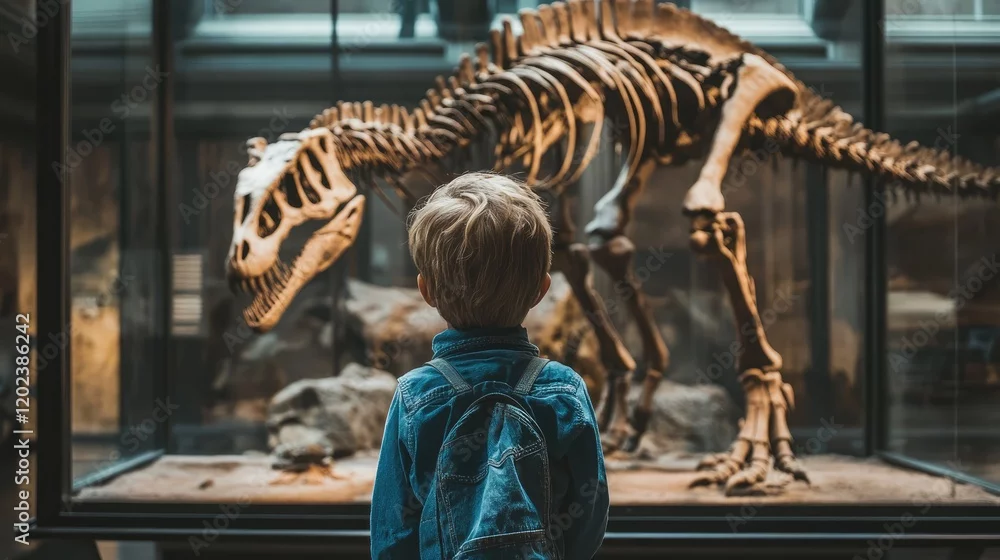Fototapeta Child looking at dinosaur skeleton in paleontology museum - dinozaury - Picturewall.pl
