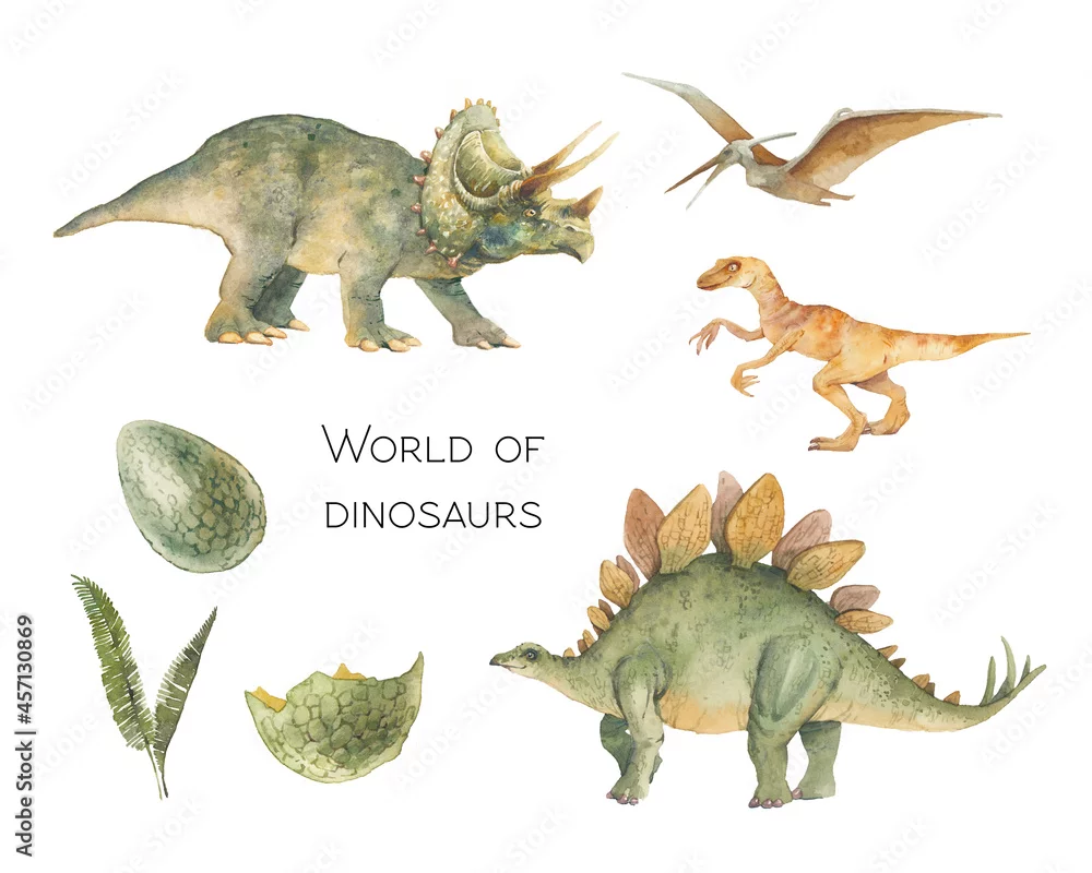 Fototapeta Dinosaurs illustration set. Hand painted watercolor cartoon dinosaur silhouettes isolated on white background.