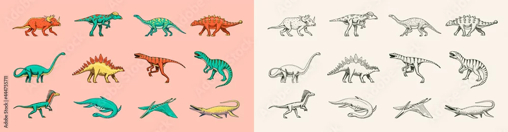 Fototapeta Dinosaurs set, Tyrannosaurus rex, Triceratops, Barosaurus, Diplodocus, Velociraptor Triceratops Stegosaurus. Prehistoric reptiles, Animal. Vintage sketch for t-shirt print. Engraved Hand drawn Animal