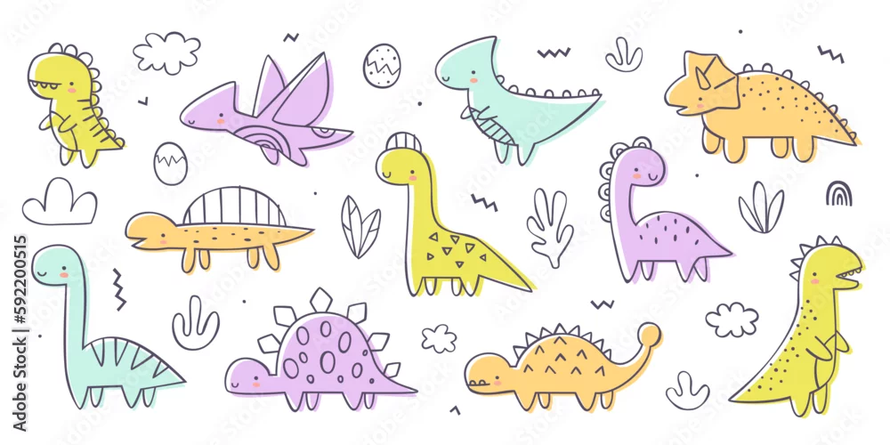 Fototapeta Doodle dino set. Cute hand drawn dinosaurs collection for kids. Naive dino doodle bundle for babies. - dinozaury - Picturewall.pl