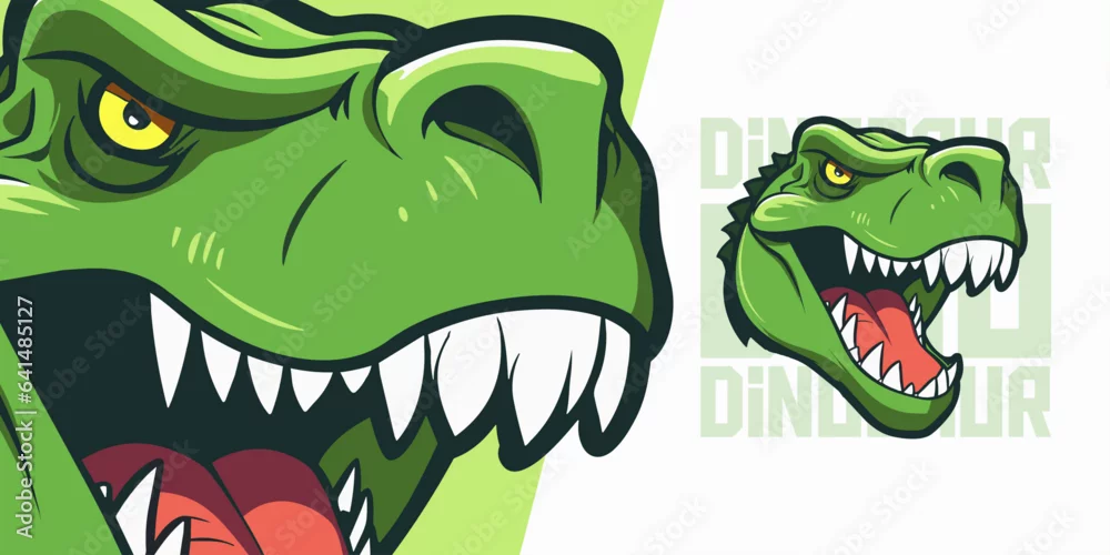 Illustrated Green Dinosaur Head Logo for Sport and E-Sport Gaming Teams, Featuring Mascot Illustration and Vector Graphic of Dino Trex Mascot Head.