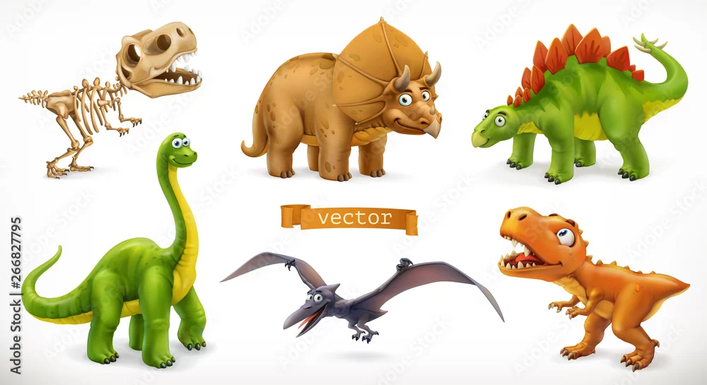 Fototapeta Postać z kreskówki dinozaurów. Brachiozaur, pterodaktyl, tyrannosaurus rex, szkielet dinozaura, triceratops, stegozaur. Śmieszne zwierzę 3d wektor zestaw ikon