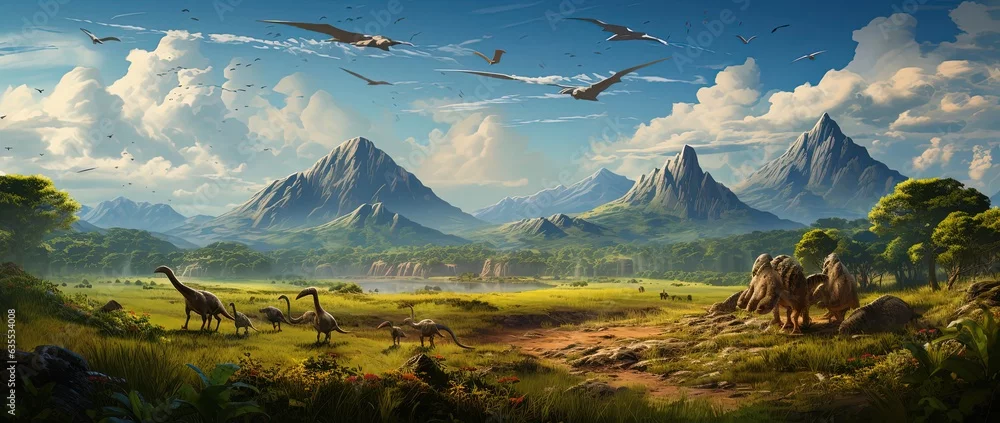 Fototapeta realistic dinasours with mountain background