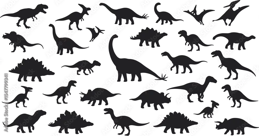 Fototapeta Silhouette dinosaurs vector collection, prehistoric animal set, black dinosaur icons for kids, dinosaur clipart, T-Rex, Triceratops, Stegosaurus, flying dinosaur, Jurassic theme illustration,