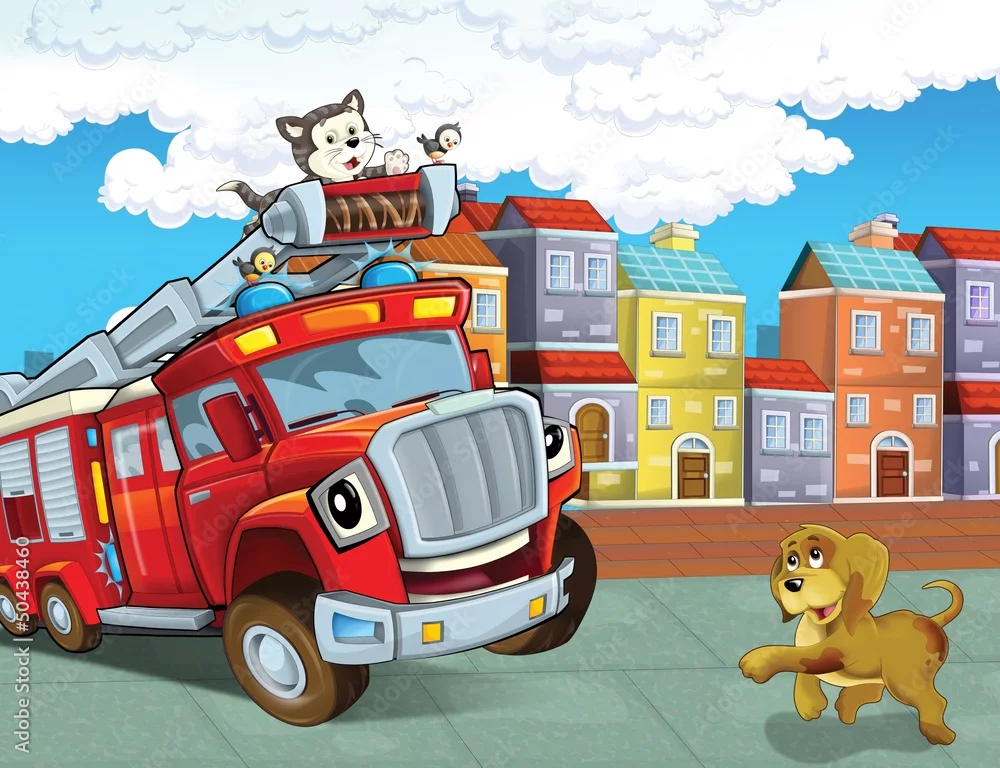 Fototapeta Czerwona wóz strażacki - obowiązek - ilustracja dla dzieci
