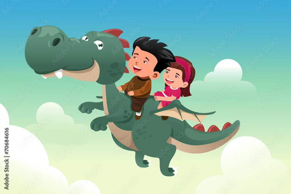 Fototapeta Dzieci jeżdżą na uroczym smoku