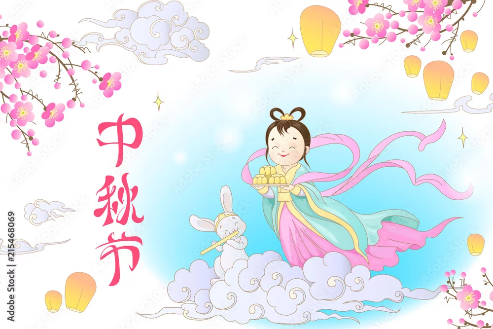 Fototapeta Chang`e i jade królik. Chińskie znaki oznaczają festiwal w połowie jesieni